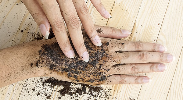 Додай в кавову гущу трохи блакитної глини і води, можна мінеральної. Масажуючи, нанести на трохи вологу шкіру. Шкіра стане більш гладка, рівна і ніжна!