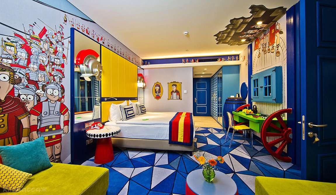 Нелегко розлучитися з розвагами парку Legoland, бо на його території створено тематичні готелі. Самий дитячий і самий хуліганський номер тут носить назву The Pirates Lego Suite. Пальма в бочці, карта з таємними знаками, невідомі землі в ілюмінаторі і акула у ванній – це припаде до душі любителям пригод. Не менш антуражны покої Короля, Лицаря і Принцеси, номери Скарбів і Пригод. В кожній кімнаті є величезний ящик з конструктором, так що декорації можна доповнити за своїм смаком. У ресторані готелю є спеціальне дитяче меню, юні гості зможуть вибрати свої улюблені страви. Зауважимо, що готелі Legoland в Гюнцбурзі, Віндзорі, Каліфорнії, Флориді та Малайзії також мають дитячі номери з казковим оформленням.