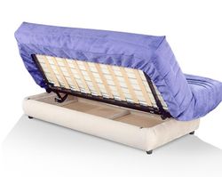 Для трансформації потрібно лише потягнути вперед сидіння. З основою на роликах, воно легко піддасться і поїде вперед. На його місці відкриється великий короб для постільної білизни. Для формування спального місця, короб закривається спинкою. Спинка і сидіння складають спальне місце, позбавлене перепаду по висоті і зазору.