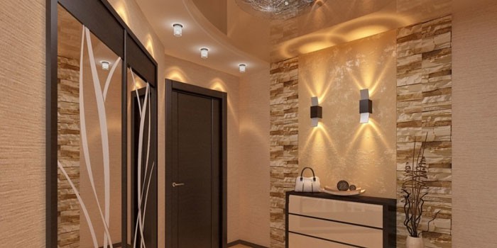 Всі квартири, за рідкісним винятком, мають вузькі передпокої. Правильним дизайном легко виправити цей недолік. Інтер’єр вузького коридору обов’язково повинен бути в світлих тонах, бажано з глянцевими поверхнями. Зробіть хороше освітлення, оформіть стіни декоративною кам’яною кладкою. Цей момент особливо актуальне для власників котів, які люблять звук отдираемых кігтями шпалер. Ще ідеї для передпокою, схожою на тунель: