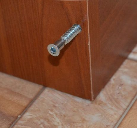 УВАГА! До недоліків даного з’єднання відноситься видима частина головки гвинта з зовнішньої сторони вертикальної стінки шафи. Але це можна дещо згладити, використовуючи меблеві заглушки.