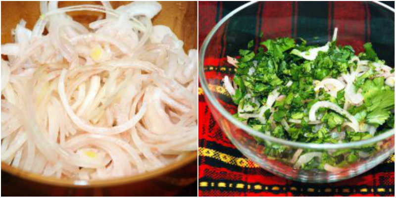 Решту зелень кінзи і петрушки дрібно наріж. Маринований лук відіжми (можеш навіть промити, щоб видалити надлишки оцту). Зелень і цибулю змішай, додавши дрібку перцю.