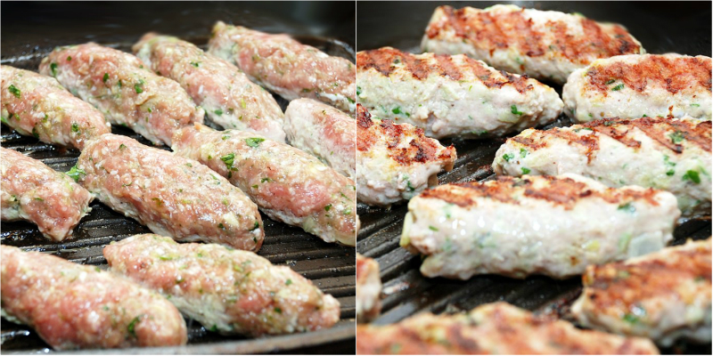 Окремо 2 цибулини наріж кільцями, залийте оцтом, додаємо перець, цукор, сіль, перемішати і залиш промаринуватися.На вологій дошці вологими руками скачай кебаби у формі ковбасок.В домашніх умовах кебаб чудово смажиться на електричній решітці або сковороді-гриль з ребристим дном. Змасти поверхню олією і ставимо розігріватися. По досягненні потрібної температури (крапля води буде шипіти і випаровуватися) виклади кебаби на сковороду і смажимо з чотирьох сторін за 3-4 хвилини.