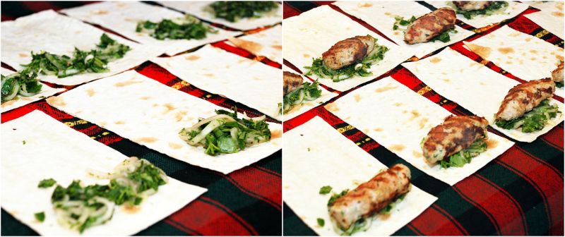Листи лаваша розріж на однакові частини. Ширина одного шматочка повинна бути приблизно дорівнює довжині ковбаски.На кожен лист лаваша викласти по ложці зелені з цибулею, потім по кебабу і згорни трубочку. Залиш на деякий час, щоб лаваш просочився соком салату і ароматом смаженого кебаба!