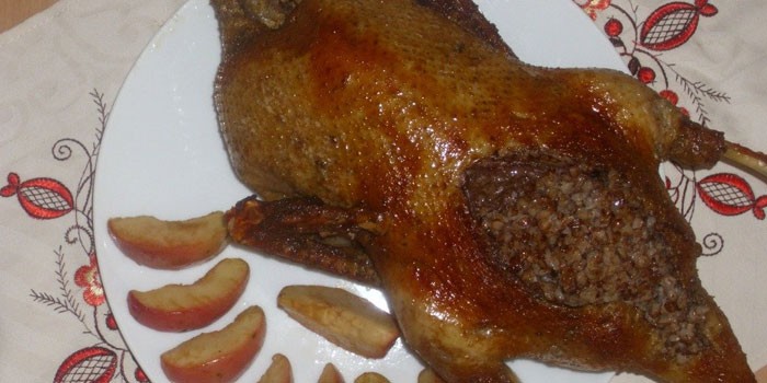 Складним з приготування, але дуже ефектним на увазі виходить гусак з гречкою в духовці. Існує кілька варіантів його приготування, класичним з яких є змішування крупи з яблуками і цибулею. Смачніше вийде блюдо, якщо тушку попередньо замаринувати в майонезі на добу. Особливо це корисно при приготуванні немолодий птиці, м’ясо якої здасться сухуватим і жорстким.