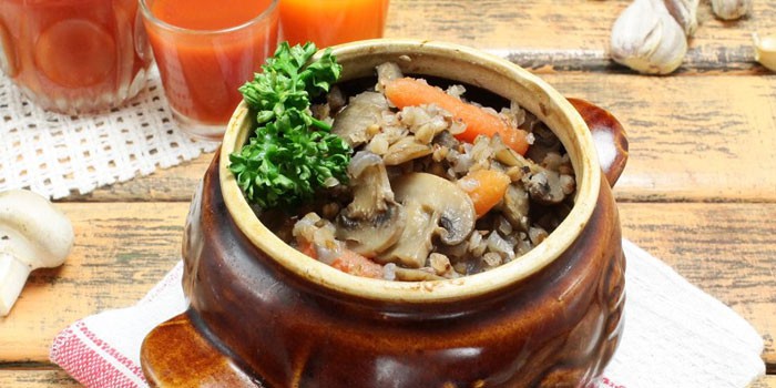 Яскравий насичений аромат має гречка з грибами в духовці, приготовлена з двох видів м’яса. Поєднання курки та свинини надає страві соковитості, цікавий смак і ефектний зовнішній вигляд. Гриби для каші можна брати будь – найкраще підійдуть лісові, білі, але при їх відсутності згодяться печериці або гливи. Подавати таку страву можна прямо в горщиках.