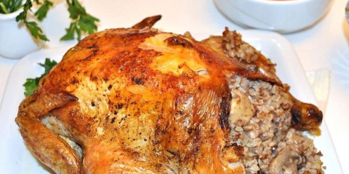 Ефектно виглядає курка фарширована гречкою в духовці, зроблена на честь сімейного торжества. Корисно знати, як приготувати цю страву, щоб порадувати домочадців та присутніх гостей. Для отримання яскравою рум’яної скоринки, яка буде хрустіти при вживанні, потрібно змастити тушку птиці майонезом. Крім крупи, начинка включає цибулю, зелень і хлібний м’якуш.