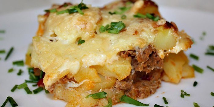 Ситним блюдом для всієї родини стане запечений фарш з картоплею в духовці з сиром. Завдяки поєднанню м’ясних і овочевих компонентів закуска виходить дуже поживною, а акуратне викладання шарами дозволяє добитися привабливого вигляду страви. Для приготування їжі по цьому рецепту підійде будь фарш баранячий, курячий, яловичий або свинячий (або їх суміш).
