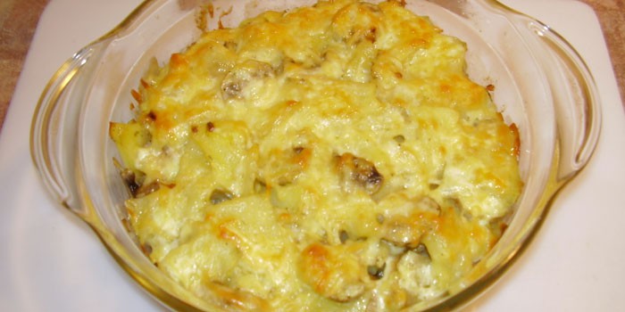 Яскравим насиченим смаком володіє картопля, запечена з грибами та сиром. Цей простий сільський рецепт зручний тим, що в ньому можна поєднувати різні гриби – печериці, гливи, лисички, будь-які лісові грибочки (підберезники або підосичники). Добре приправити страву чебрецем, чорним перцем або травами. Додати можна гострі плавлені сирки або сирний соус з часником, а подавати рекомендується на салатних листках.