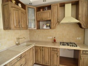 Всі відтінки бежевого (від молочного до світло-коричневого) ідеально виглядають з полицями та шафи в природних деревних тонах. Який з нюансів буде використаний на стінах конкретної кухні залежить від оздоблення меблів.У багатьох випадках підійдуть: