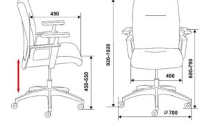 Параметри комп’ютерного крісла повністю залежать від ваших уподобань, росту, ваги. На малюнку представлені розміри стандартного крісла для дорослої людини. Від цих розмірів будемо відштовхуватися. Якщо вас щось не влаштовує, то змінюйте розміри.