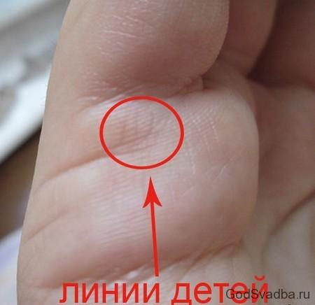 Так от, лінія шлюбу знаходиться між нашим орієнтиром і початком мізинця. Якщо ви ще її не побачили, то злегка зігніть пальці і поверніть трохи долоню до себе бічною стороною.