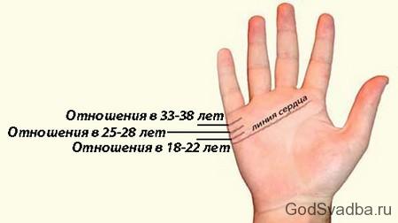 Тепер подивіться, до якого з цих відрізків найближче розташована ваша лінія шлюбу. Це і буде відповіддю на питання, коли ви вийдете заміж.