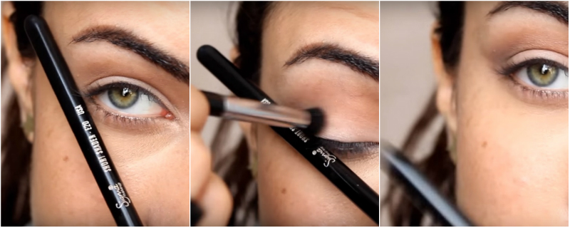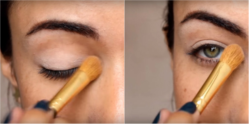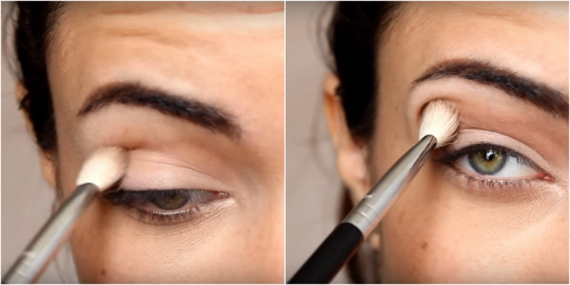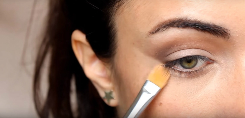 Бежевими тінями виділи складочку на верхньому столітті. Розтушуй під кутом вгору у напрямку до кінчика брови.