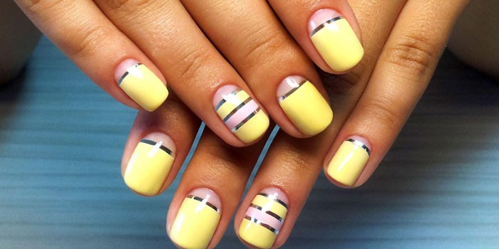 Для початківців легкий варіант – використовувати манікюр смужки з шаром, що клеїть. Чудово виглядають блискучі лінії на матовому тлі, поздовжні і поперечні, розташовані хаотично. Для здійснення ідеї потрібно:
