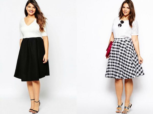 Колірний колорит фасону А силуету невеликий. Представлені кольору чудово поєднуються з будь-якими блузками, кофтами. Це полегшить процес підбору верхньої частини образу до спідниці. Власницям виступає животика рекомендується звернути увагу на картату драпирующуюся тканина. Клітина – завжди актуальний варіант, що додає образу загадковості. Колірна гамма картатих виробів може бути різною. Власницям пишних форм радять звернути увагу на поєднання білий + чорний.