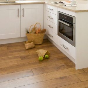 Щоб підлога на кухні не спучитися з-за частих прибирань і підвищеної вологості повітря, придивіться до ламінату, у назві або описі якого є слово «Аква». Маркування говорить, що розглянута продукція мало схильна до деформації і руйнування при контакті з рідинами і пором.