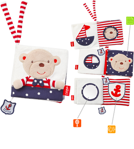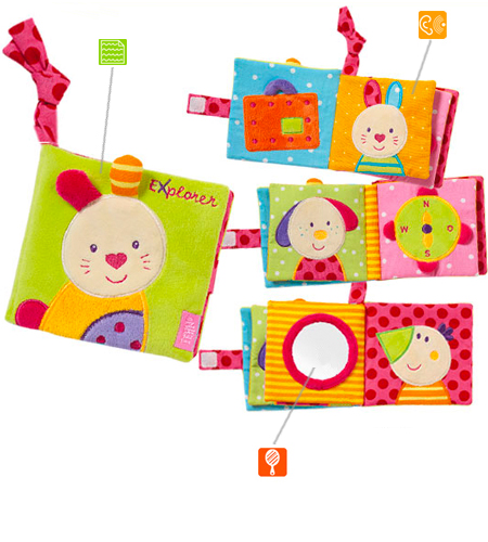 Майже у всіх дивовижних колекціях компанії Fehn є одна або кілька яскравих книжок з різними розвиваючими елементами. У кожної є об’ємні м’які деталі, дзеркальце, шуршалку і пищалка, у деяких зустрічаються міні-прорізувачі. А ще всі вони передбачають кільце або пару стрічок, що дозволяють кріпити іграшку на каркас ліжечка або коляски. Колірне оформлення виробів теж продумано: кольори розподілені блоками, створюючими помітний контраст, крім однотонного забарвлення зустрічаються смужку, горошок, ромби, квадрати і флористичний візерунок.