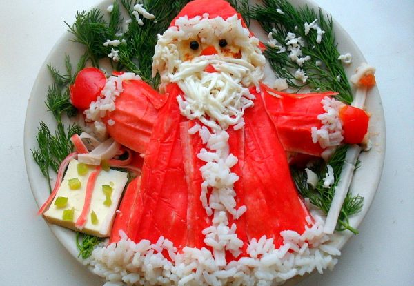 - Готовий салат викласти на велике блюдо, у вигляді Діда Мороза. При цьому, шуба повинна складатися із залишків крабових паличок.