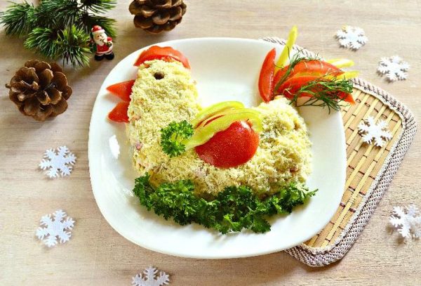 Ще один новий салат на Новий 2019 рік викладається у вигляді улюбленого казкового персонажа. Цей рецепт з фото не тільки простий і смачний, але так само сподобається тим, хто не любить великої кількості м’яса.