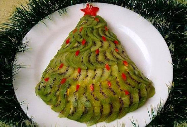 - На красиве блюдо салат викладається у вигляді ялинки. Кріп, кукурудза, зерна граната і оливки використовуються в якості прикрас.