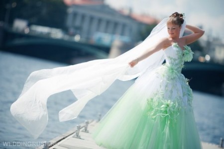 Наречена буде чарівна в сукню кольору. Якщо вона вибере коротке плаття, то верх повинен бути закритим або з невеликим декольте. Довге плаття в підлогу передбачає відкритий верх. Можна також вибрати пишну сукню, декороване смарагдом.