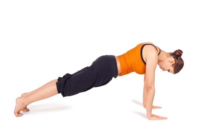 Встаньте в планку.Притисніть пальці ніг, і крок за кроком зволікайте ноги тому, щоб розтягнути їх, як можна далі за вашим тілом.Вдихніть, дивіться прямо перед своїми долонями, щоб ваша шия і хребет вирівнялися.Напружте м’язи черевного преса і утримуйте їх.Ваше тіло повинно сформувати пряму лінію. Переконайтеся, що ваші руки лежать плазом на землі, а ваші пальці розведені.Затримайтеся на 15-30 секунд або як можна довше.Видихніть і станьте на коліна.Повторіть цю позу 5 разів з відпочинком не менше 15 секунд перед кожною позою.Якщо у Вас високий кров’яний тиск або будь-який тип травми плечей або спини, не виконуйте цю позу.