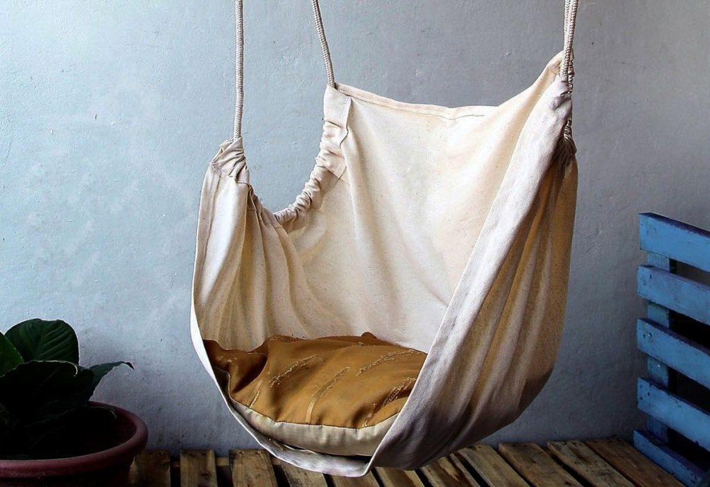 Яскравий приклад краси простоти. Знадобляться тільки відріз тканини, шнур і швейна машинка або голка з ниткою. Боковини майбутнього крісла відгинаються і пришиваються до іншого полотна, формуючи кишені під мотузку. Потім шнур протягується в них і затишний куточок практично готовий. Можна прикріпити його прямо до стельового гака, тоді вийде дуже компактна версія. Якщо ж шнури попередньо зафіксувати на краях дерев’яної або металевої планки, то сідати в крісло стане трохи зручніше.