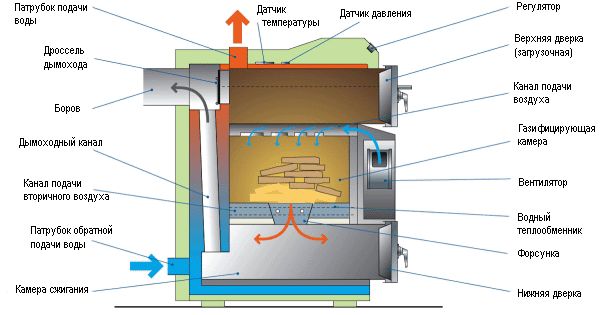 Важливо! Піролізний котел відрізняється від решти устаткування тим, що в ньому горить не тільки паливо, але і газ, що виділяється при його згорянні.