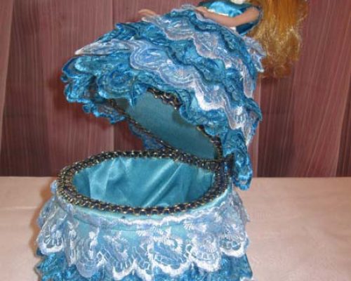 Можна зробити на подарунок дочки своїми руками красивих дам різних епох, принцес казок і улюблених дитячих мультфільмів, дівчат у національних костюмах. Далі потрібно позбавити ляльку від ніжок і закріпити на кришці. Для цього її можна прикрутити саморізом або приклеїти. Кришку також закриваємо тканиною за типом мішечка. Далі робимо топ для ляльки і пришиваємо його до цього самого мішечку. Після цього, починаючи від талії і переходячи до нижньої частини шкатулки, обшивають смужками мережива, фатіна і органзи. Таким чином, виходить лялечка в пишній сукні.