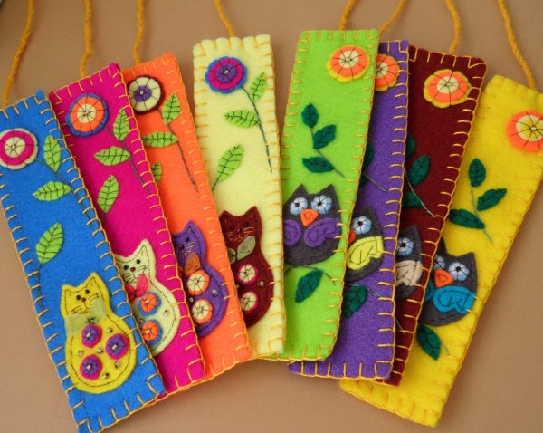 Варіант складніше. Закладка з фетру. Для неї потрібен лист фетру. З нього вирізаємо 2 однакових прямокутника, закруглений, з одного боку, і з вушками з боків з іншого боку. На одному з прямокутників, з тієї сторони, де вушка робимо мордочку. Пришиваємо кілька намистин для вічко, кружечок фетру темного кольору для носика і вишиваємо нитками вусики і ротик. Зшиваємо 2 прямокутника по краю. Можна прилаштувати знизу хвостик з сплетеною з ниток кіски або вузькою атласної стрічки.