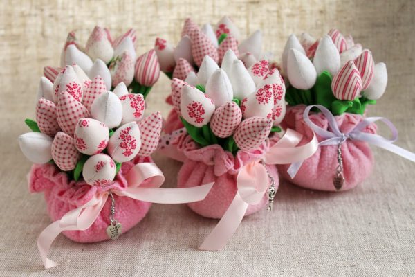 Для тих хлопців, хто хоч трохи вміє шити руками або на машині, можна підготувати до маминого свята букет з м’яких затишних і стильних тюльпанів. Це буде чудовий подарунок мамі на день матері своїми руками від доньки 14 років або старше.