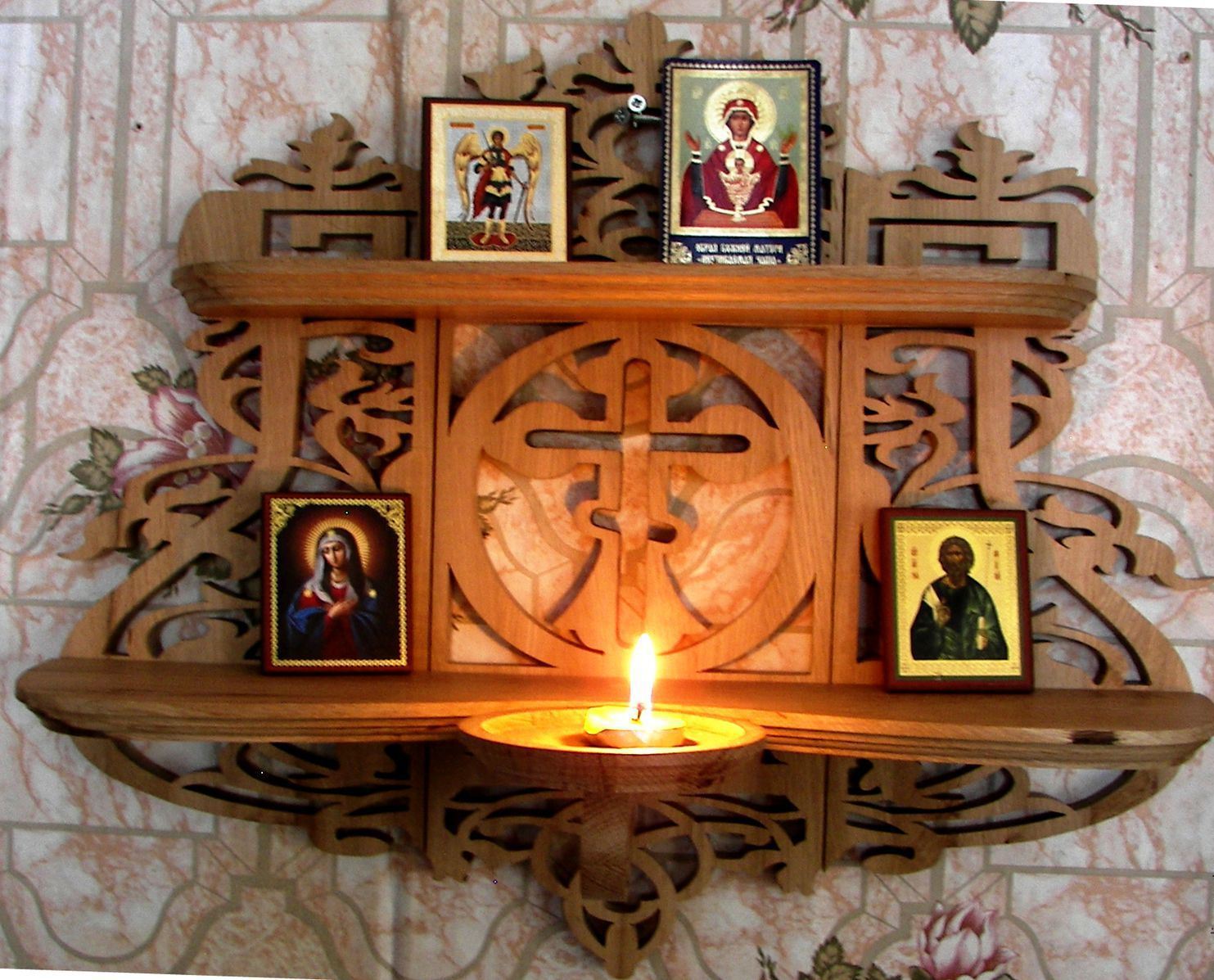 Існує досить велика кількість полиць та зі складною конструкцією. Вибір розміру кожної деталі залежить від кількості ікон, місця розташування самої полиці і форми деталей.