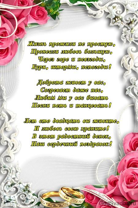 - Дорогі ювіляри! Сьогодні чергова річниця з дня вашого одруження. Незважаючи на довгі роки, проведені разом, ви змогли зберегти любов і щирість по відношенню один до одного. Бажаємо вам довголіття, добра і процвітання!