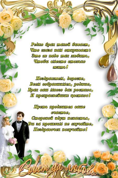 - Сьогодні у всіх присутніх на душі безмежна радість – ми відзначаємо світле день благодатній весілля! На чолі столу сидять красиві люблячі один одного протягом 70 років люди. Нехай в цей чудовий день благодать спуститься до вас з небес! Миру вам! Добра! Любові!