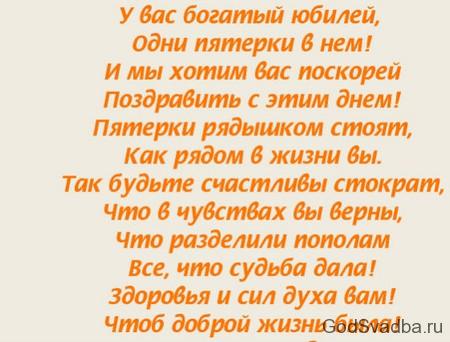 Мило буде виглядати, якщо дружина влаштує для чоловіка сюрприз, і підготує смішні і прикольні короткі привітання у віршах, які нагадають йому про те, що навіть через 55 років шлюбу любов все ще в її серці. Чоловік також може вивчити вірш, і зізнатися в своїх почуттях коханої.