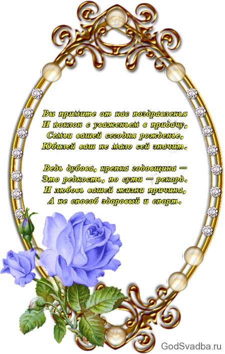 У привітанні нагадайте, що дуб — дерево-довгожитель, у якого з роками деревина стає міцнішою, так і союз двох стає одним цілим, зміцнюючись з кожним роком. Це послужить прикладом молодим сімейним парам. Короткі смішні пісеньки, вірш виконані дітьми, онуками створять святкову атмосферу.