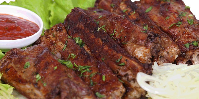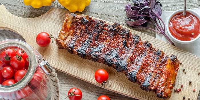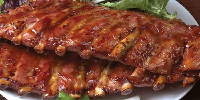 Гострим соковитим смаком володіють свинячі реберця барбекю в духовці. Якщо готувати їх спочатку з використанням духової шафи а потім додатково обсмажити на решітці гриль, то вийде літній ароматне блюдо, добре підсилююча апетит на свіжому повітрі. Подавати таку закуску добре з овочевими соусами, свіжими томатами, огірками, паприкою та зеленню.