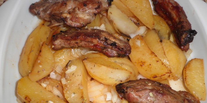 Дуже ситним і калорійним стравою називають ребра з картоплею в духовці, тому що поєднання м’яса та овоча робить його високопоживним. Виходить гарнір з другою стравою, приготовані одночасно, що економить час господині. Подавати реберця найкраще гарячими, з прикрас допускається свіжа подрібнена зелень, часточки лимона, салатні листя.