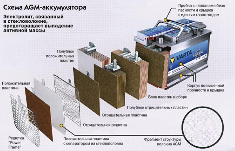 - AGM – це комбінація двох попередніх конструкцій, в них наповнювач з скловолокна або іншого подібного матеріалу просочується електролітом і поміщають між пластинками. До переваг відносять дозвіл працювати при нахилі під кутом і стійкість до вібрацій. Однак недбалість з кордонами зарядки і розрядки призводить до виходу з ладу.