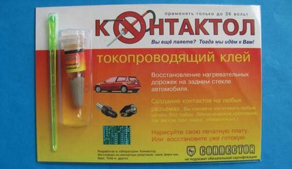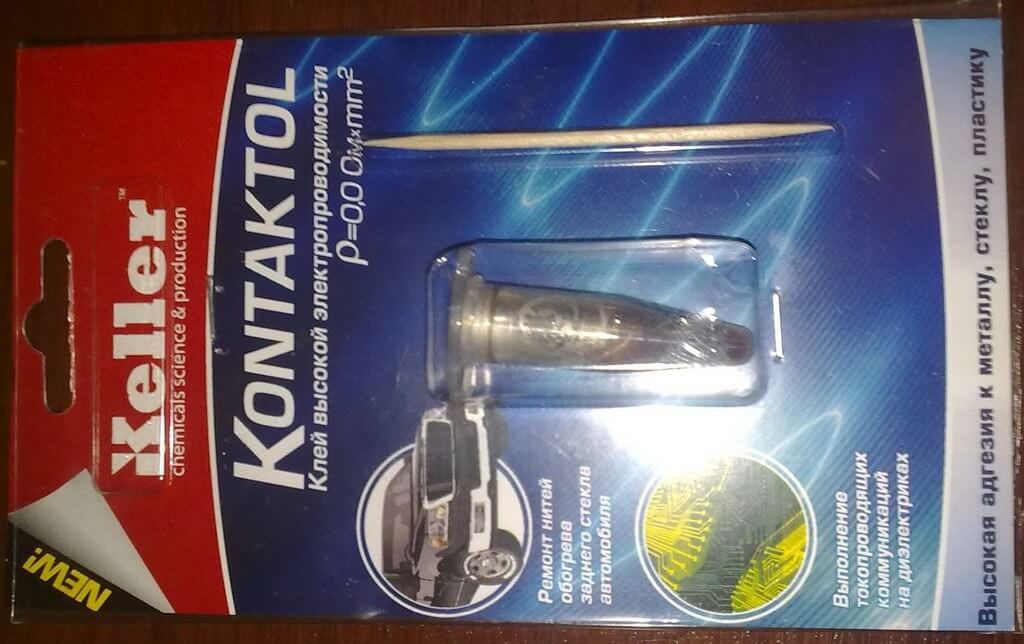 - Струмопровідний клей. Він вважається одним з найбільш простих способів, так як поодинці (без тирси) забезпечує проведення струму. Клей, що продається в наборі з трафаретами і пензлем, наноситься на місце обриву ниток за допомогою шприца або пензлика. Ви повинні перекрити цілу частину нитки по 1 см з обох сторін. Висихає засіб близько доби. Деякі користувачі вважають, що клей потрібно додавати трохи йоду. Це забарвить його в червоний колір обігрівачів. Відгуки про засіб суперечливі.
