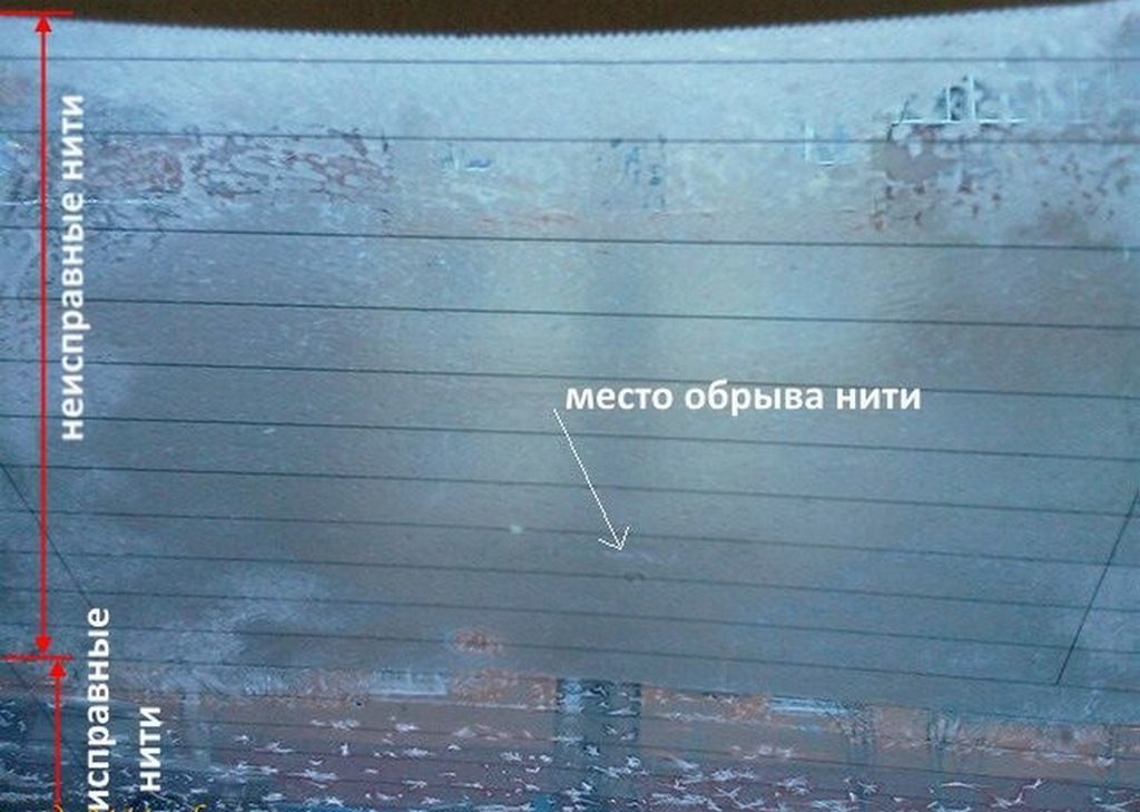 Обігріватися частина скла автомобіля припиняє із-за обриву нитки, яку ви, наприклад, можете зачепити абразивом, видаляючи клей від тонувальної плівки. Так як елементи обігріву тонкі і при певному освітленні практично не видно. Існує кілька способів виявлення обриву: