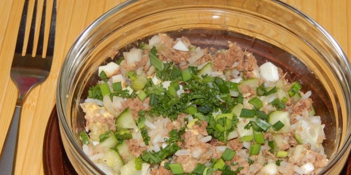 Приготувати салат з риби з рисом і яйцем можна з будь-якого продукту – вареного, консервованого або смаженого. Перевага такого рецепту в тому, що з додаткових компонентів тут можна обмежитися лише цибулею, свіжим або смаженим, і майонезом, якщо більше у вас нічого немає під рукою. Якщо ж є можливість додати щось ще, віддайте перевагу свіжих огірків або маринованим корнишонам, консервованому горошку або кукурудзи.