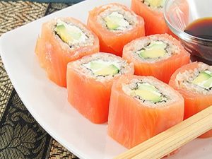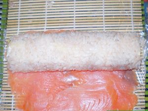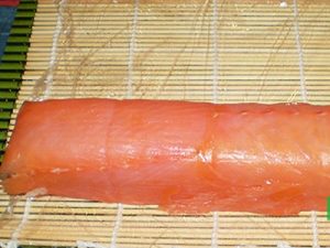 Обертати. Тепер потрібно обернути його шматочками риби. Для цього сьомгу дуже тонко ріжуть. Після чого кладуть на килимок, застелений поліетиленом. Зверху кладуть рол. Акуратно загорніть його другий раз. Намагайтеся загортати рол дуже щільно, щоб риба не відшаровувалася від нього згодом.