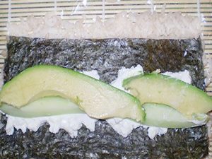 Викладати. Далі на рис викладають начинку. У нас це сир, риба, огірок і авокадо. Спочатку рясно змастіть заготівлю сиром. Після – укладіть інші інгредієнти. Сиру кладіть побільше. Не шкодуйте його.