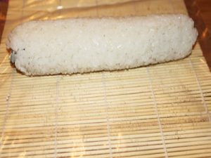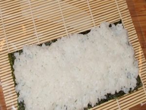 Розподіляти. Відварений рис рівномірно розподіляють по поверхні норм. Щоб рис не приставав до рук, змочіть їх водою. Відразу укладіть норі на спеціальний килимок, який вам знадобиться для скручування ролів.