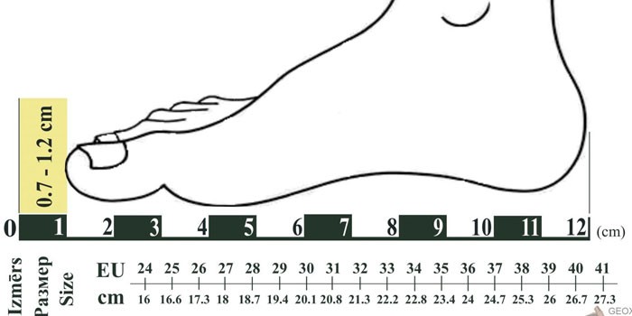 Щоб визначити розмір ступні у немовляти, який ще не встає, використовуйте рулетку або мотузку, яку потрібно прикласти від п’ятки до кінця великого пальця. Виміряйте ніжку дитини, який вже ходить, можна, поставивши його на аркуш паперу й обвівши стопи маркером. Неусидчивому малюкові намочіть ніжки водою і поставте на папір: мокрий слід допоможе визначити відповідний розмір. Нижче запропонована таблиця дитячих розмірів взуття, яка допоможе визначитися з вибором моделей фірм Казка, Кенгуру, Барракуда:
