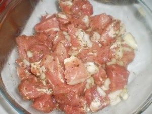 В першу черговість розбираємося з м’ясом. Охолоджений шматок промиваємо і укладаємо на чисту ганчірку. Як тільки вся зайва волога скла, прибираємо всі жилки і плівки, непридатні для вживання. Потім виконуємо нарізку на шматки 5 см*5 см Викладаємо їх в ємність для маринування.