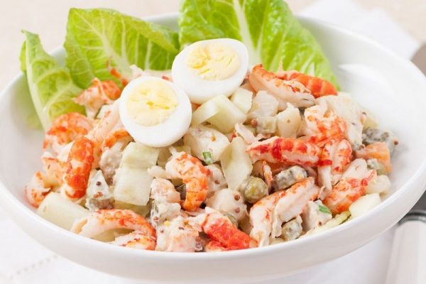 - Морський коктейль. Для його приготування потрібні варені кальмари, креветки, крабові палички, відварені яйця, свіжий огірок. Якщо є бажання – можна взяти бебі-восьминогів і гребінці. Всі приправляється майонезом.