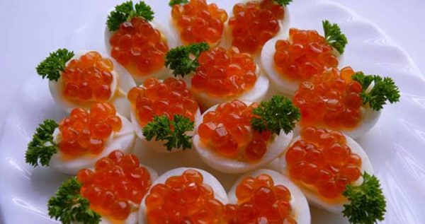 - Фаршировані яйця з червоною ікрою. Для начинки перемішуємо варений жовток і вершковий сир, зверху яйця прикрашаємо грою.